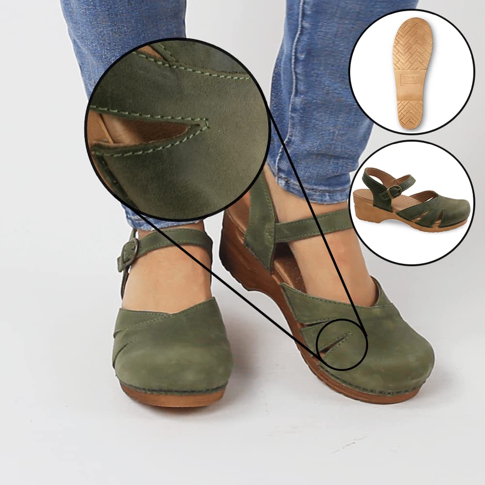 - CLOG STYLE SANDALS FOR WOMEN: The Margrethe features a waxed leather upper with small cutouts and an adjustable buckle on the strap. This sandal features a padded microfiber insole with an anatomically correct footbed.